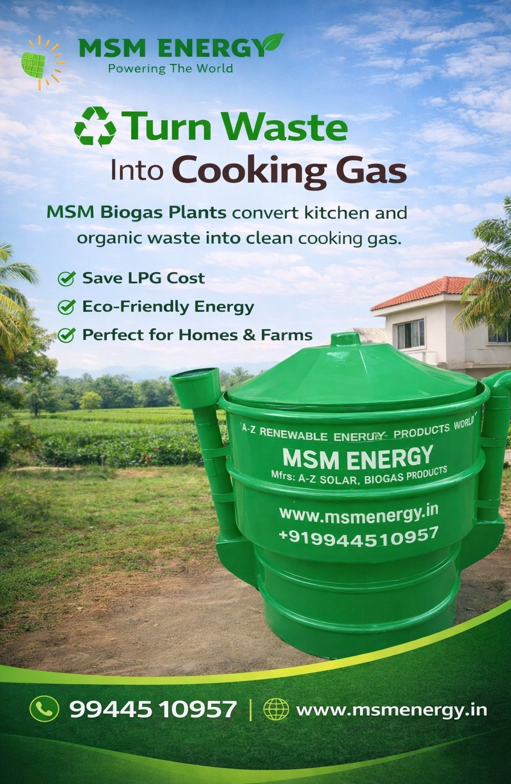Say goodbye to rising LPG costs and switch to smart, sustainable living. MSM Energy Biogas Plants convert kitchen and organic waste into clean cooking gas for your home or farm. ๐ 99445 10957 ๐ www.msmenergy.in #MSMEnergy #BestSolarCompanyInCoimbatore #wasteturnsintogas #SolarEnergy #BiogasPlant #CleanEnergy #EcoFriendlyLiving #RenewableEnergy #WasteToEnergy #GreenFuture